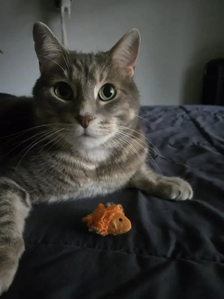The toy became more than something to chase — it was part of Walter’s emotional world. For a cat who guarded his feelings so carefully, this battered orange fish was the one thing he openly adored.