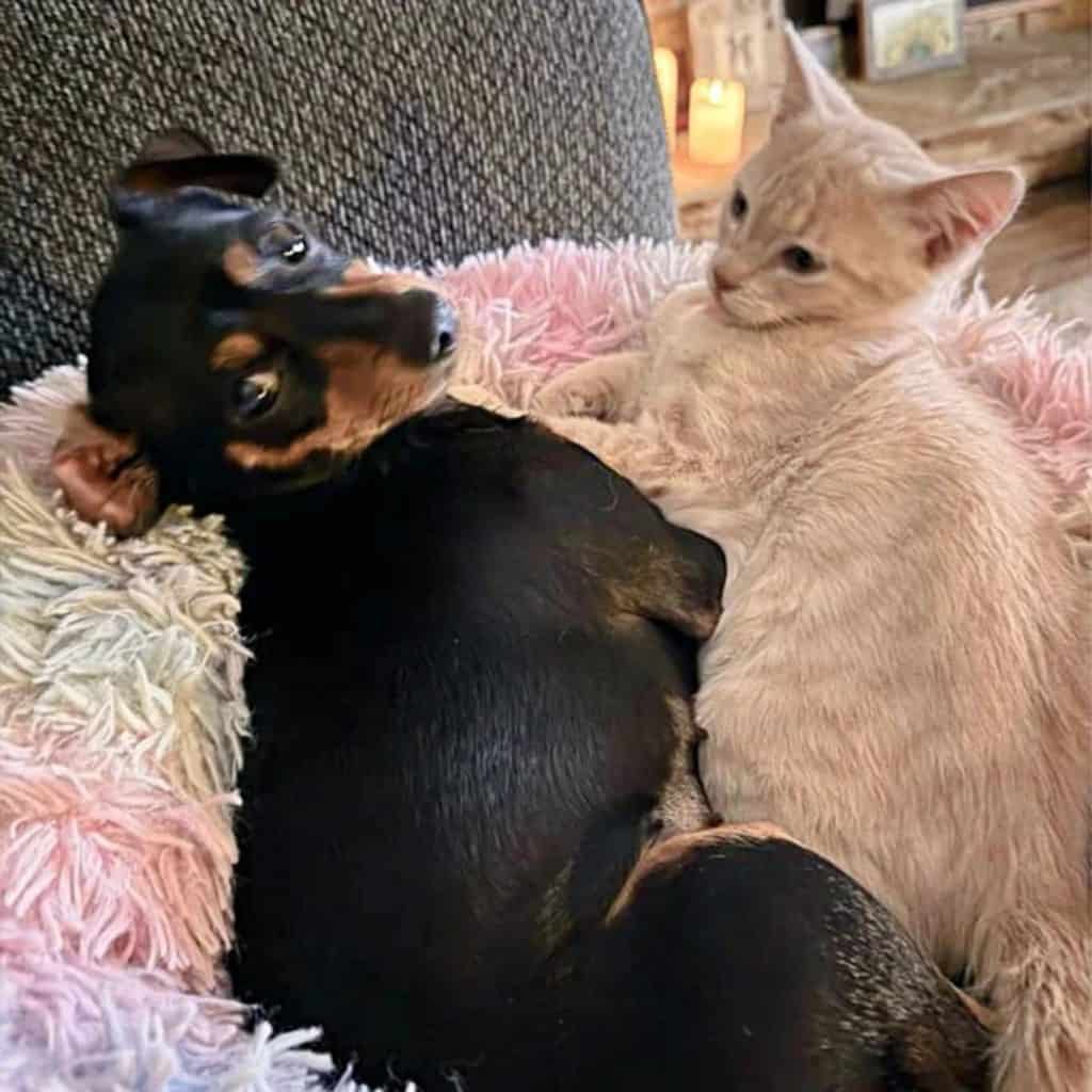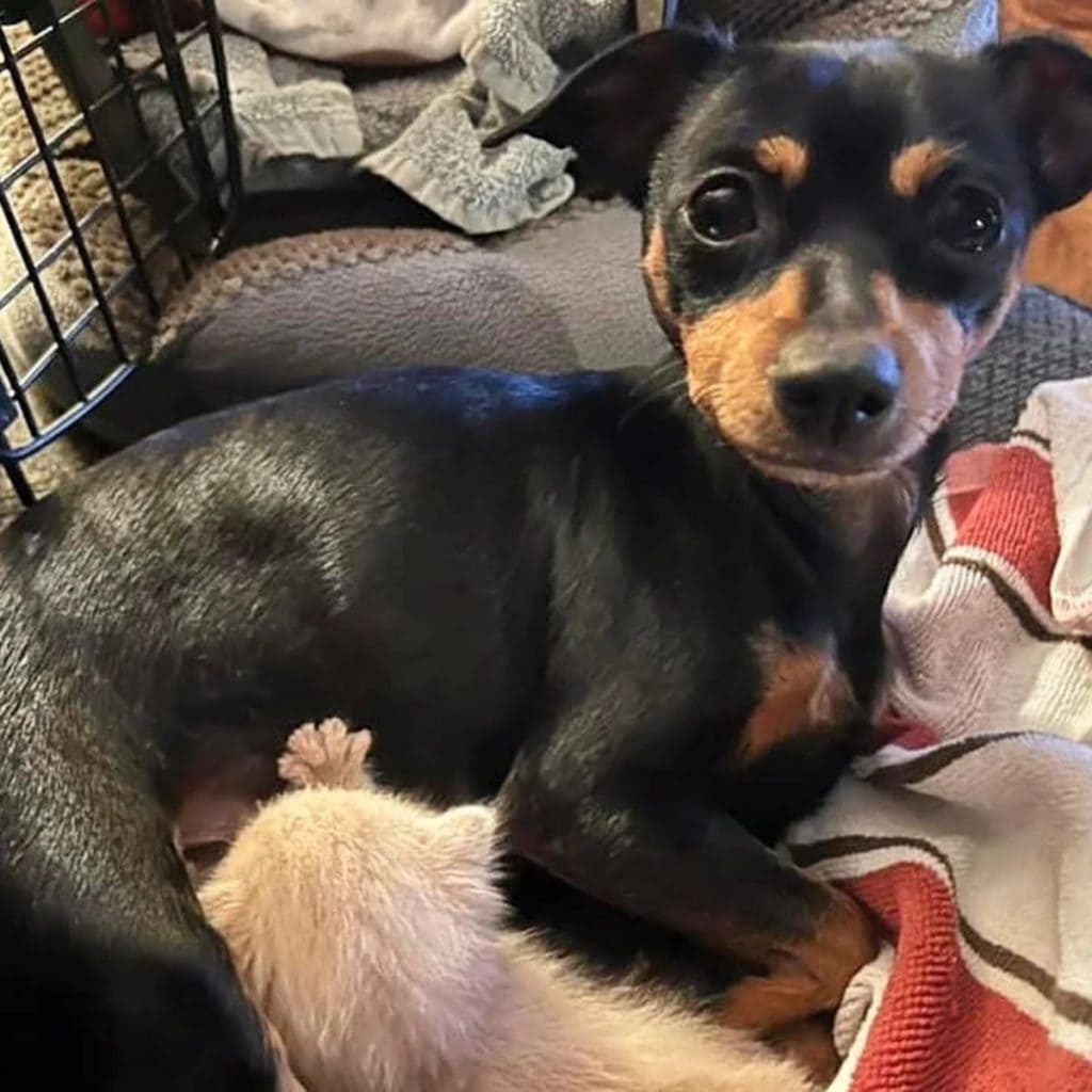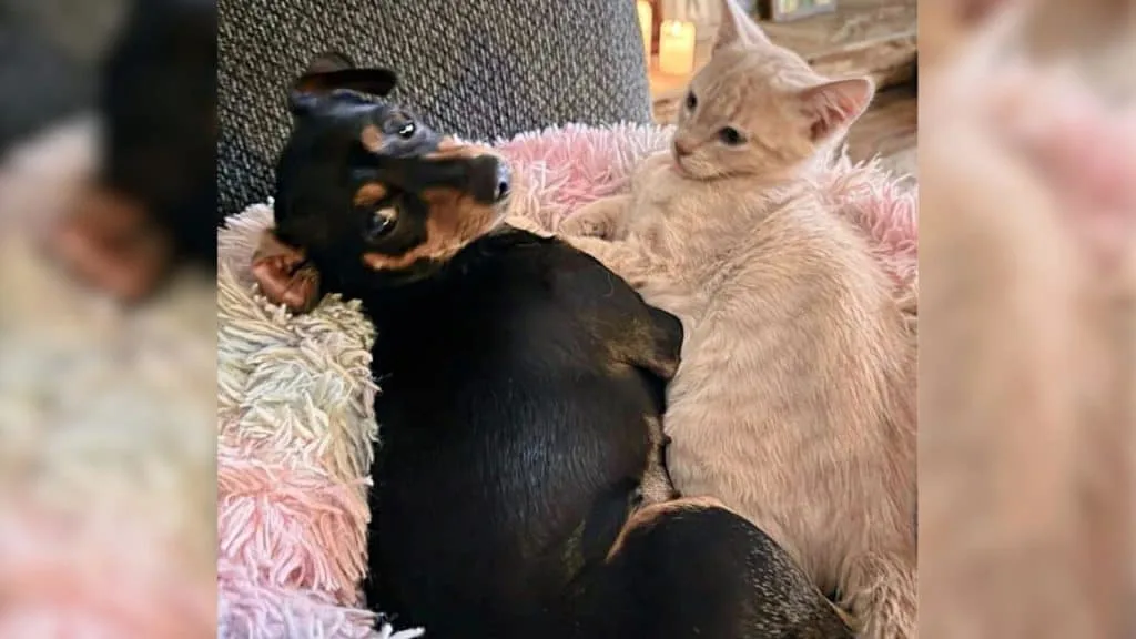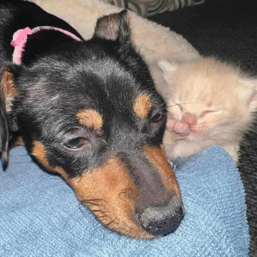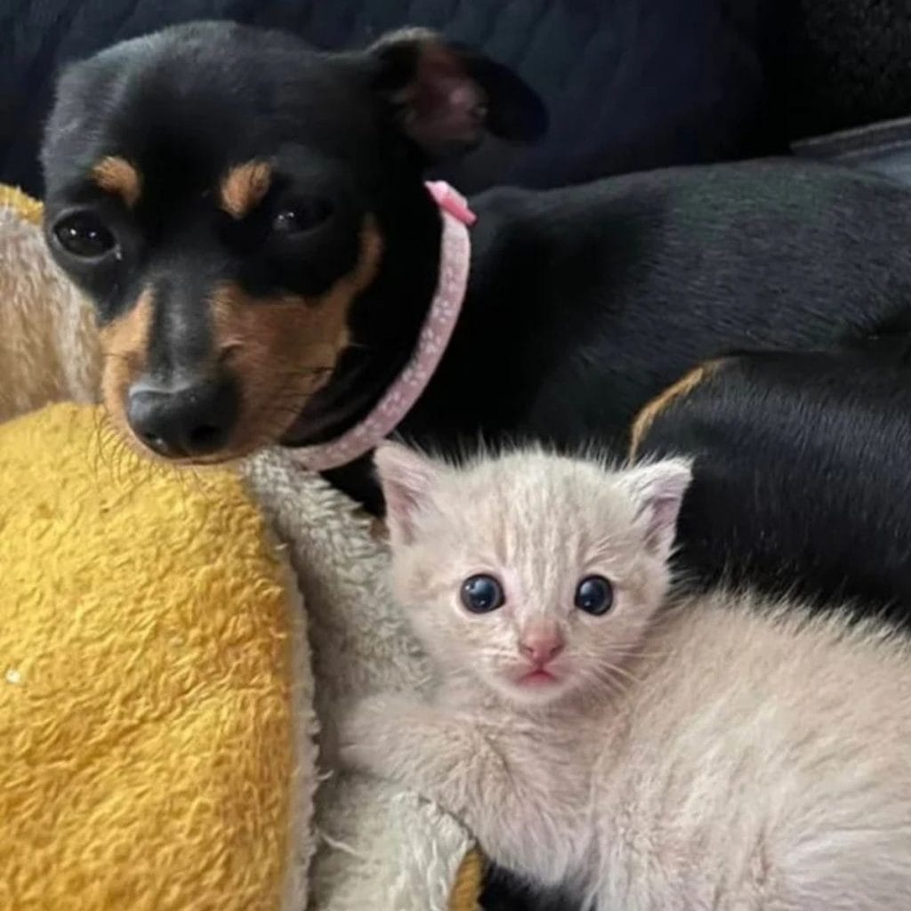 Life has a way of bringing the right souls together at the right moment, even when everything feels lost. That’s exactly what happened when a fragile kitten and a grieving mama dog crossed paths.