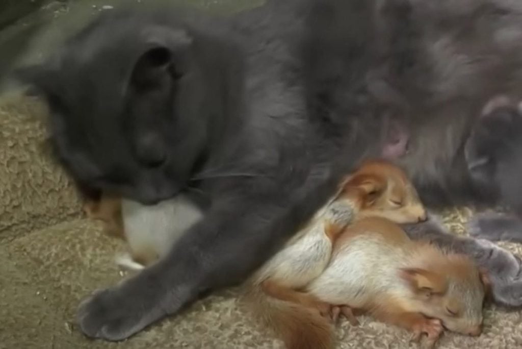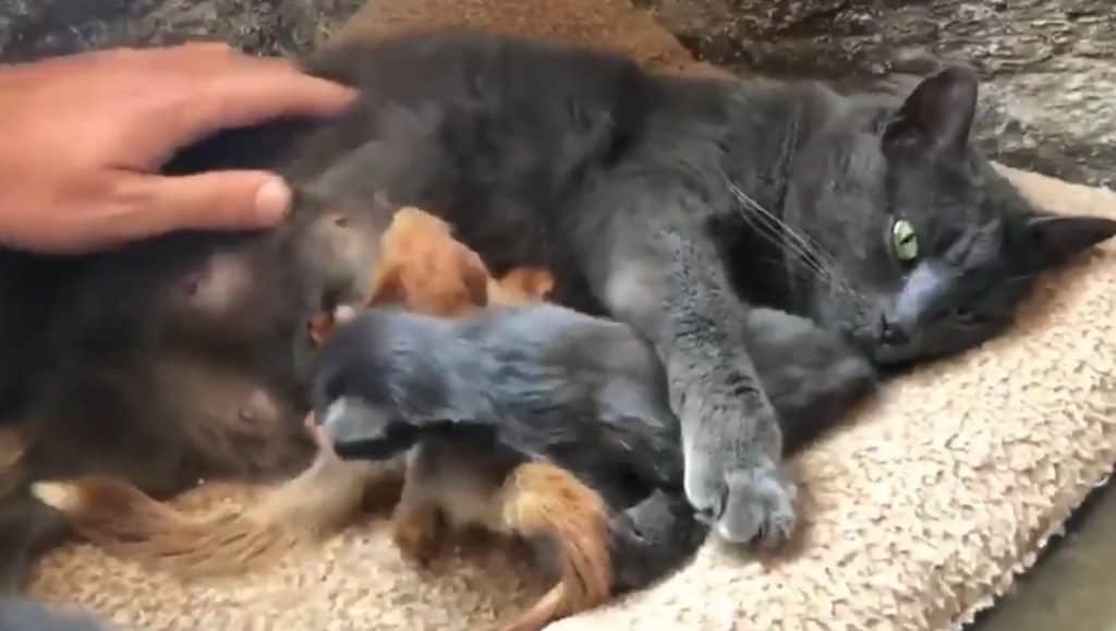 Kittens watched from their nearby nest as the baby squirrels pressed against Pusha’s belly and into her soft fur.
