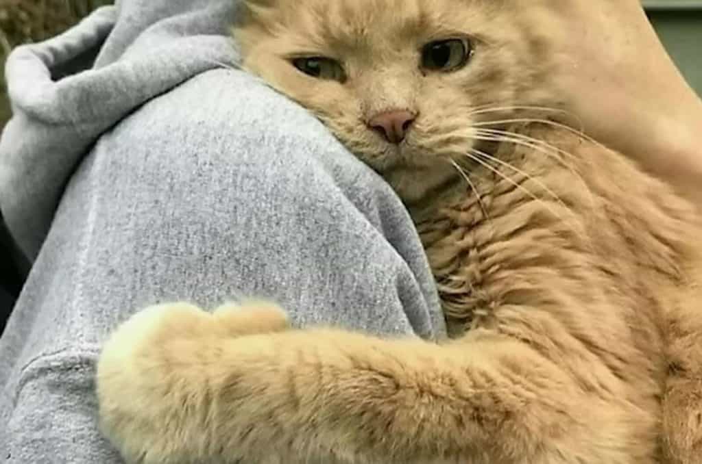 As the cat approached, aged yet still recognizing the familiar presence, he stretched his paws toward Robert and pressed his body against him with a fervent urgency.