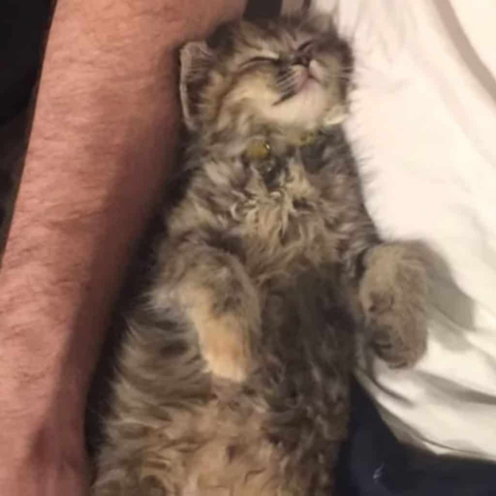 The first evening together set the tone for their new life. When Keith settled in for the night, Gracie curled herself into the crook of his arm, let out a soft purr, and drifted off as if she had always slept there. Her trust was immediate.