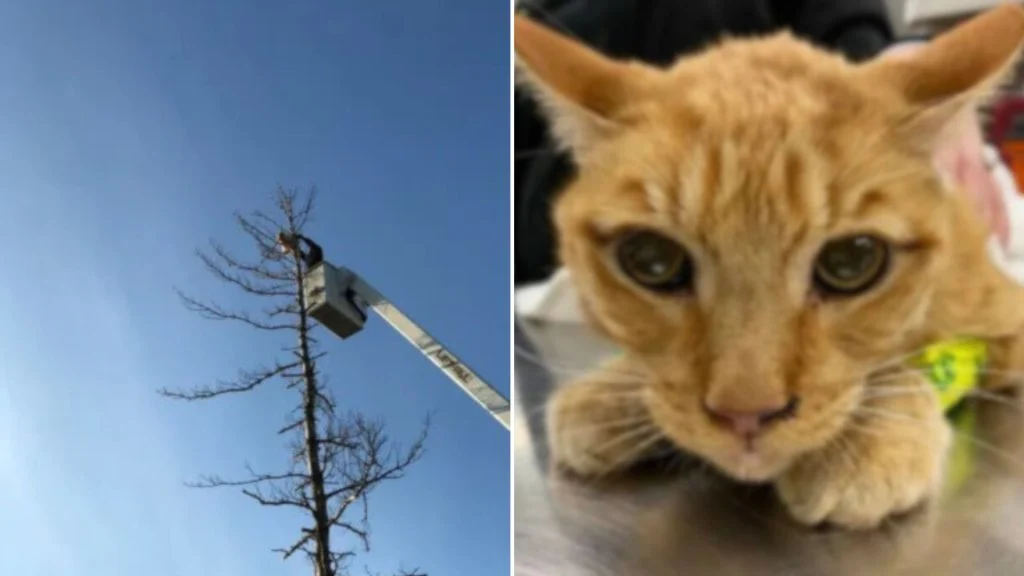 High above the houses, a ginger cat clung to a thin branch.
