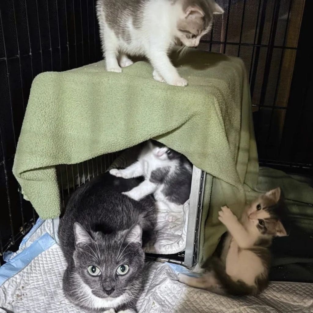 She kept her kittens spotless, tucked them against her chest when they got sleepy, and even climbed up to the top of a hiding box when she needed a break from her energetic trio. With steady meals and a safe home, her strength returned day by day.