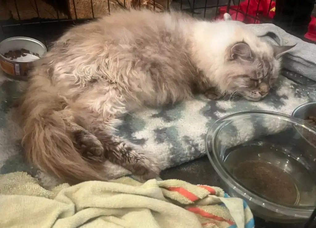 The cat, now curled up by the fireplace, was exhausted but calm — almost as if she knew she was safe at last.