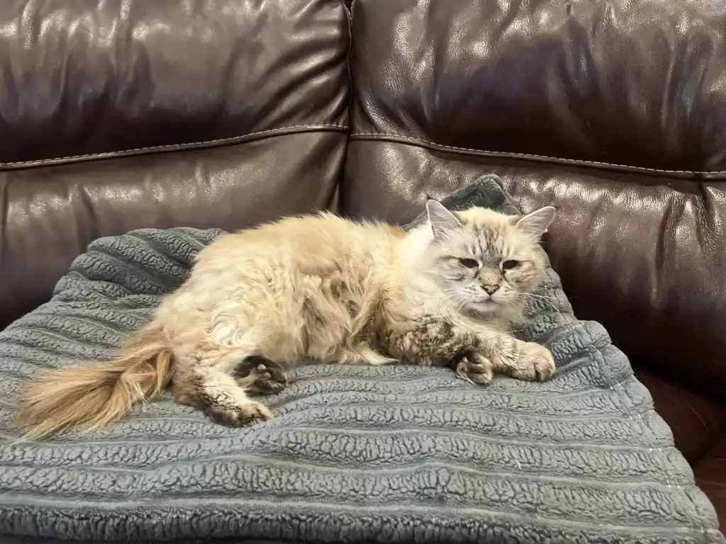 Now, Lucky Boots spends her days lounging in warm spots, following Heather from room to room, and curling up by the fire as if it’s her rightful place.