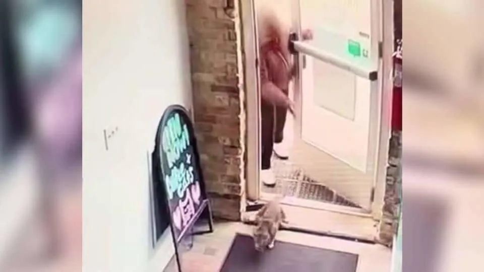 The door swung shut, leaving the cat staring back in confusion before dashing deeper into the café. Startled but concerned, two workers followed her soft cries until they spotted her hiding under a chair.