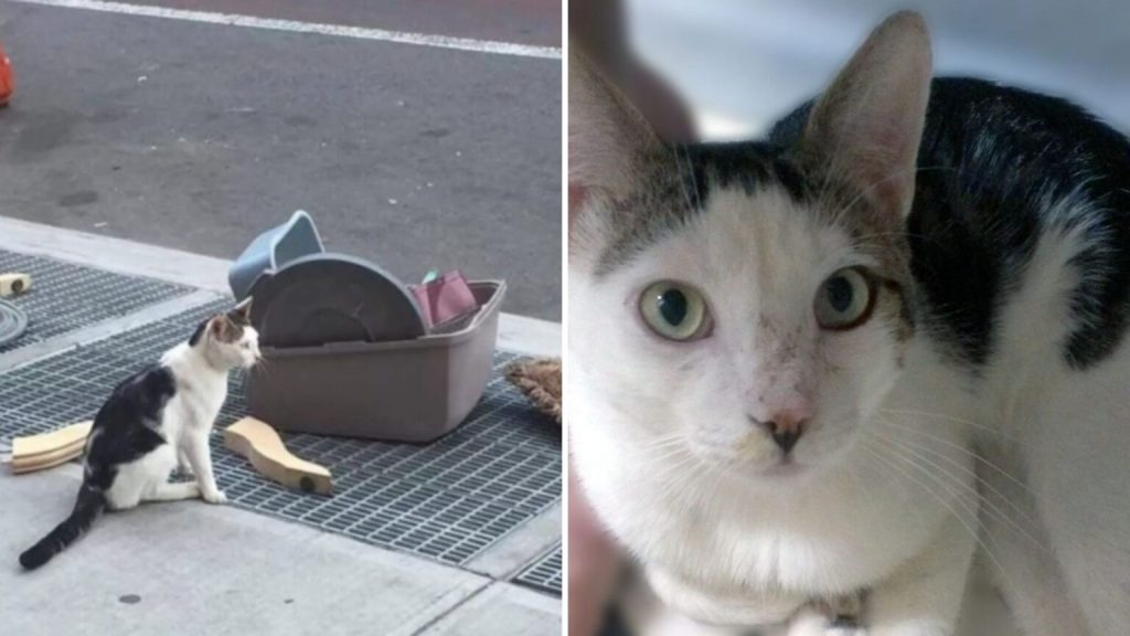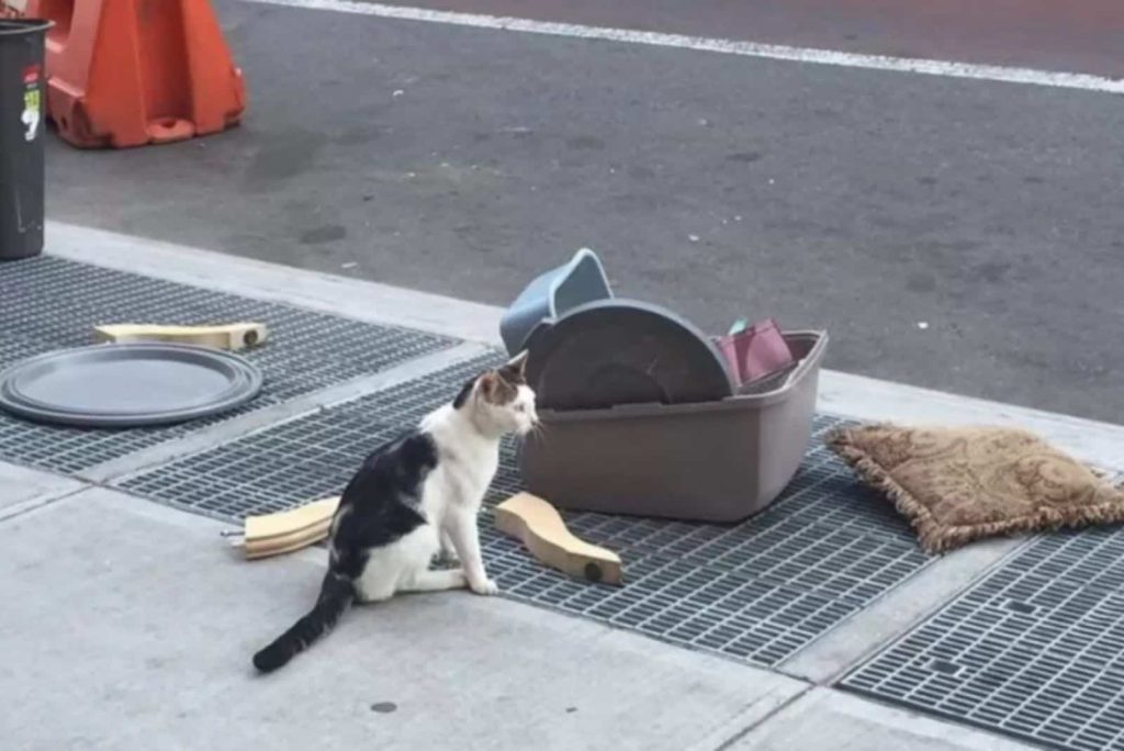His litter box sat nearby, making it painfully clear that someone had packed his life and simply tossed it onto the street.
