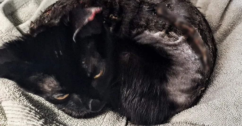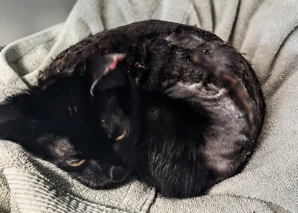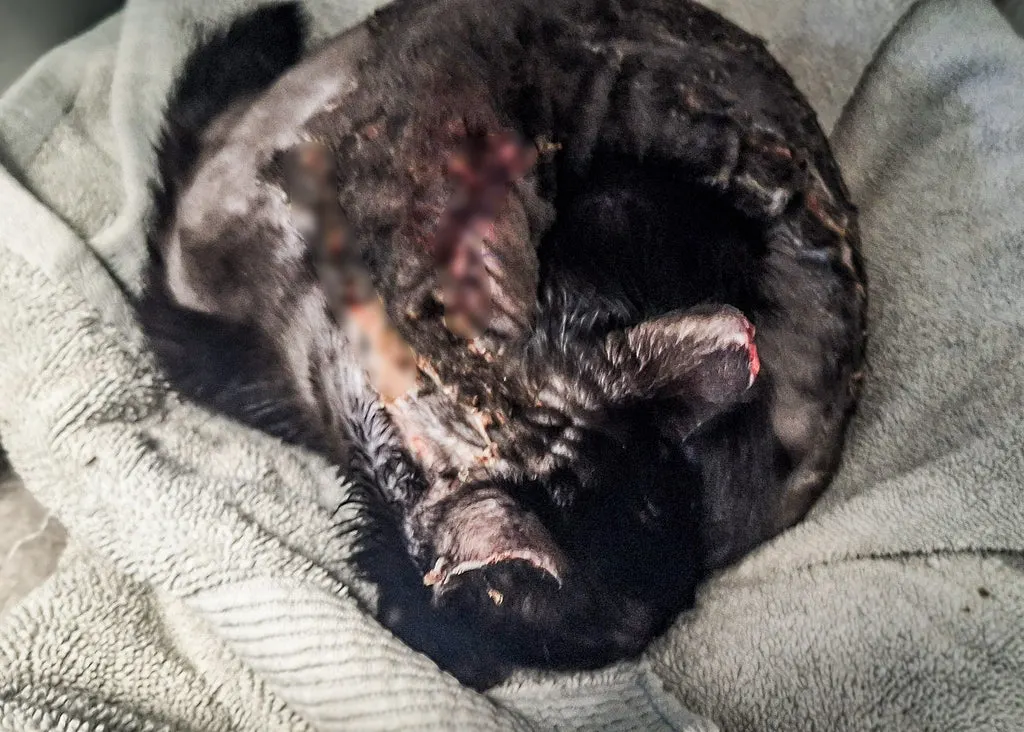 His fur was burned away in patches, leaving raw skin that stung with every breath.