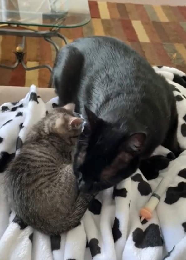 The former feral cat was “mothering” the kitten.