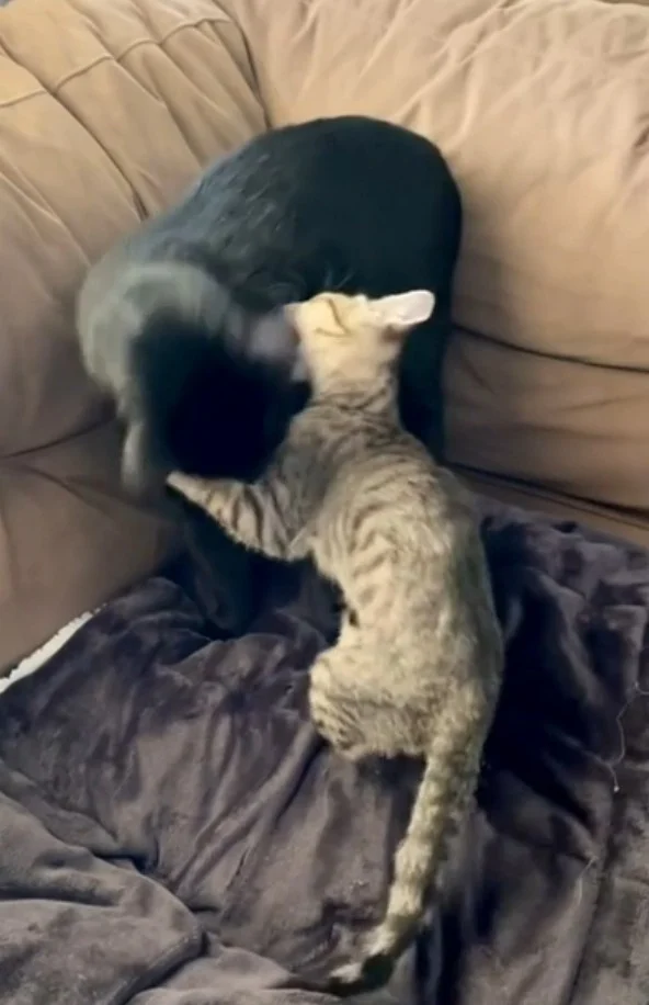 When the kitten bit too hard, the older cat corrected him with a firm stare.