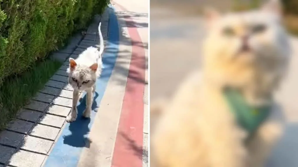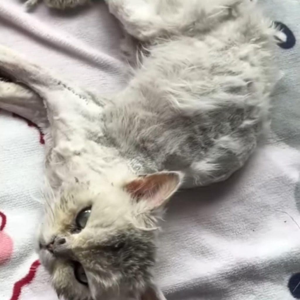 It was a cat — painfully thin, trembling from hunger, and covered in uneven patches where her fur had been shaved or fallen out.