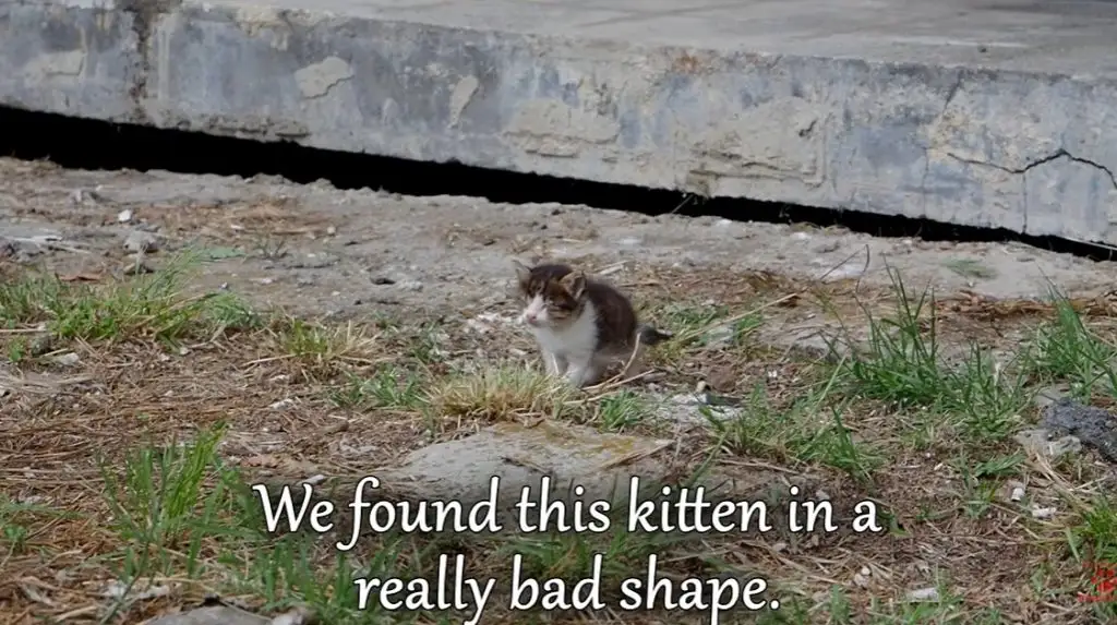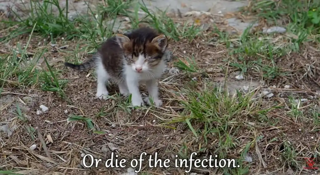 A tiny blind kitten sat alone on the cold ground.