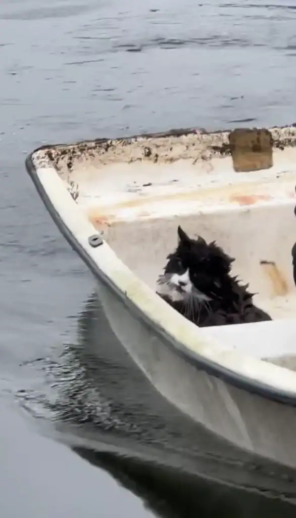 Then, just before the cat could slip beneath the freezing water for good, Nate reached over the side of the boat and scooped him up. The cat collapsed into his arms — soaked, shaking, but alive.