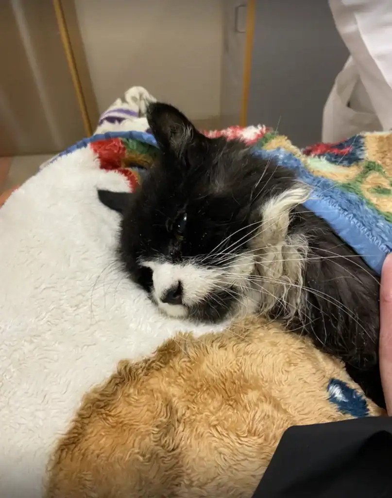After several tense hours, the treatment began to work. The cat slowly stirred, then lifted his head, as if realizing he was safe.