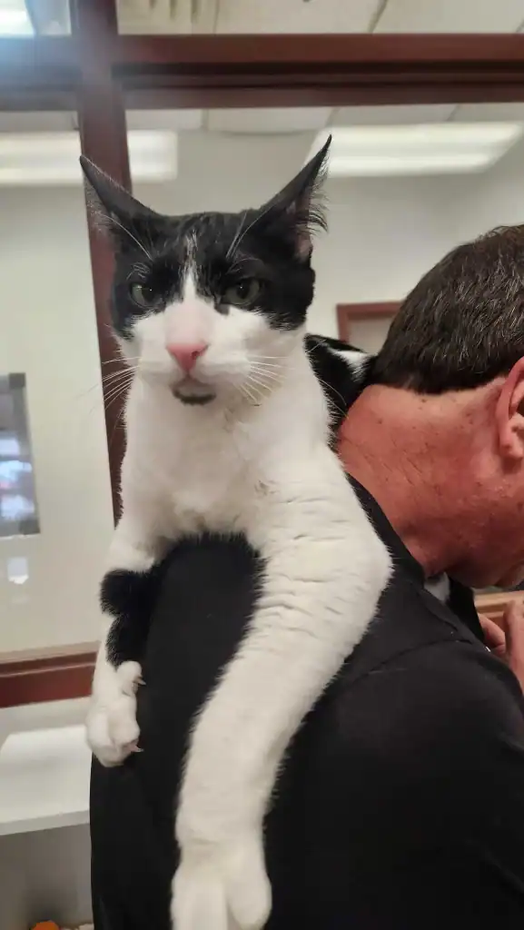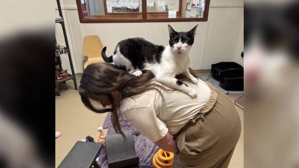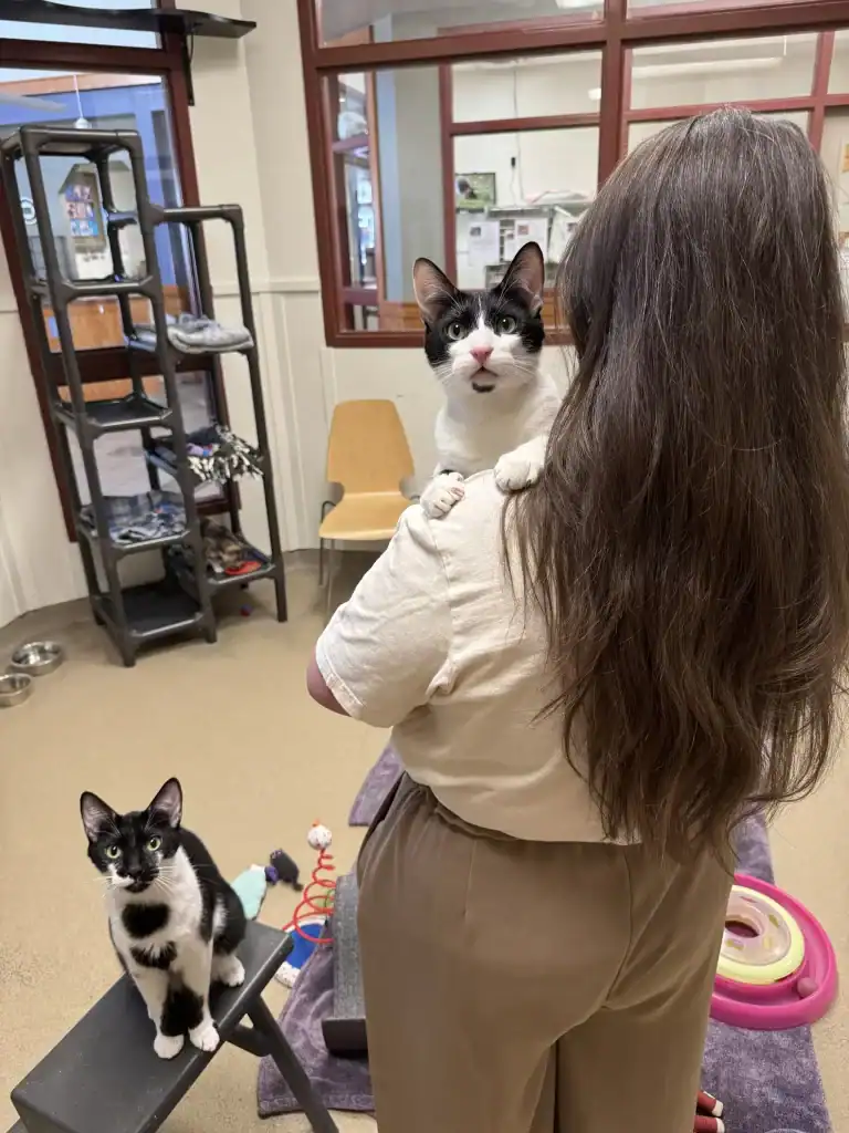 The staff quickly learned that while both cats are outgoing, Tucker is the true character of the duo. From the moment he arrived, his favorite trick became clear.