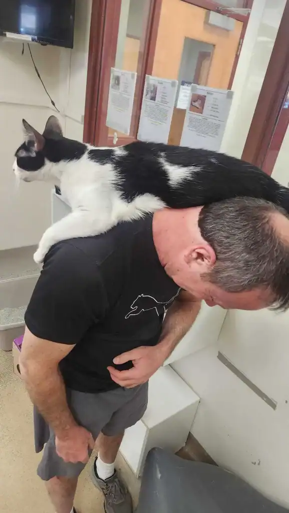 He doesn’t just greet people with a paw or a meow — he leaps straight onto their shoulders, claiming his perch like a king surveying his kingdom.