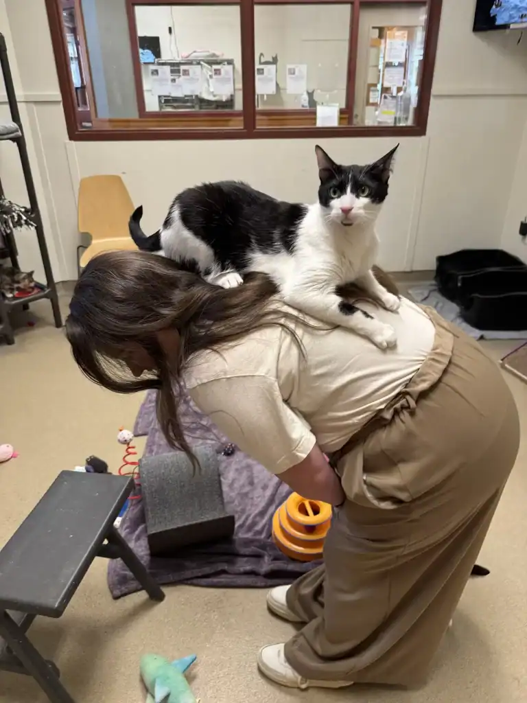 Shelter staff laugh that Tucker is part “acrobat” and part “shadow,” always ready to spring from the floor, a counter, or even a shelf just to reach his favorite spot.