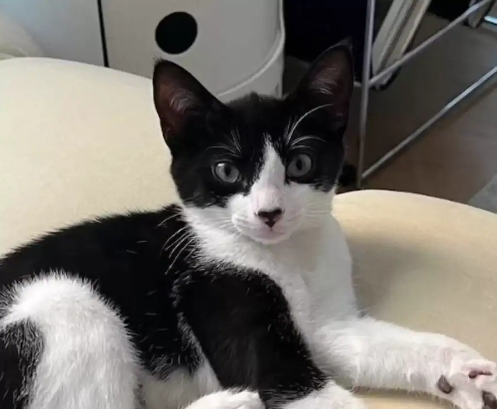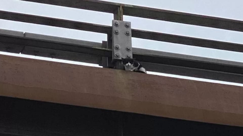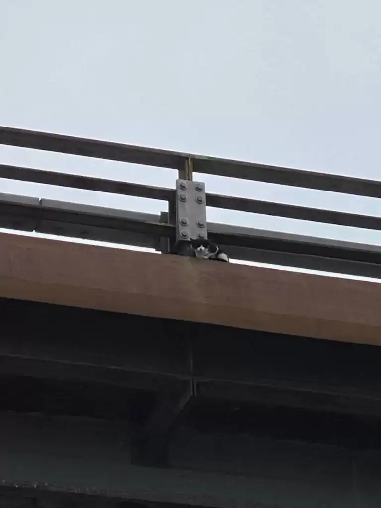 But when he focused, he realized it wasn’t a pigeon at all. Perched precariously above the busy roadway was a small, black-and-white kitten, curled tightly against the concrete edge.