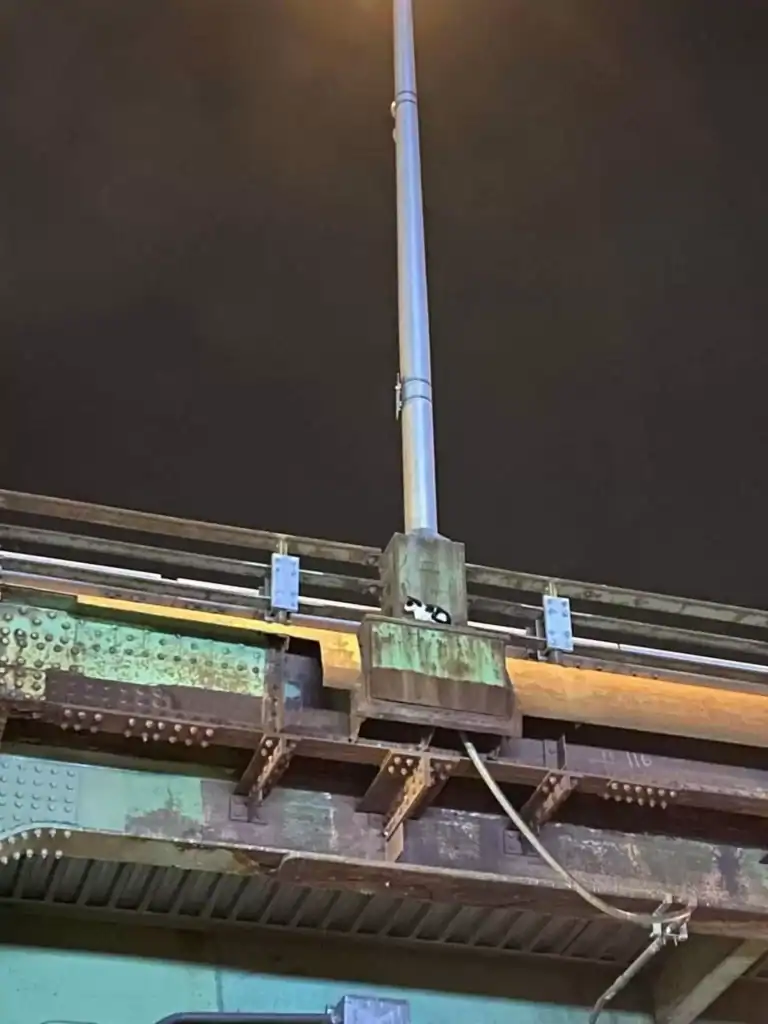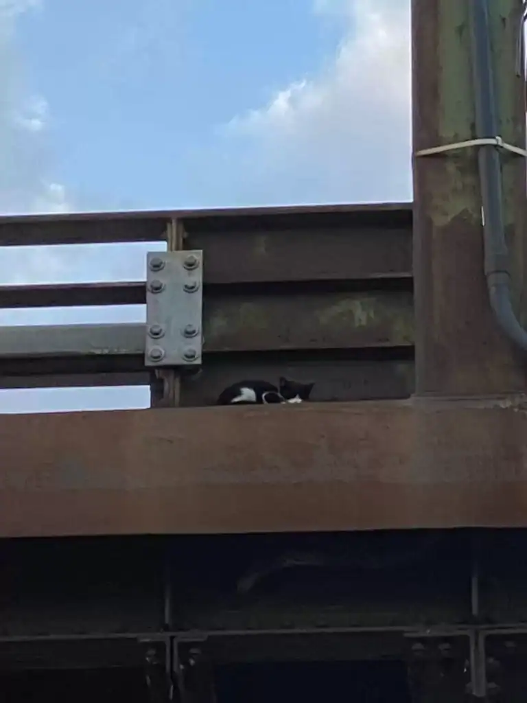 The kitten wasn’t on the ground or hiding under a car — he was stranded high above traffic, exposed to every danger possible. One wrong move could mean disaster.