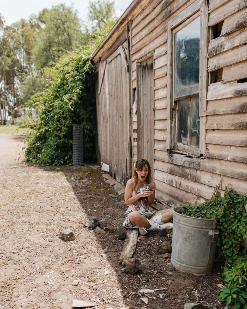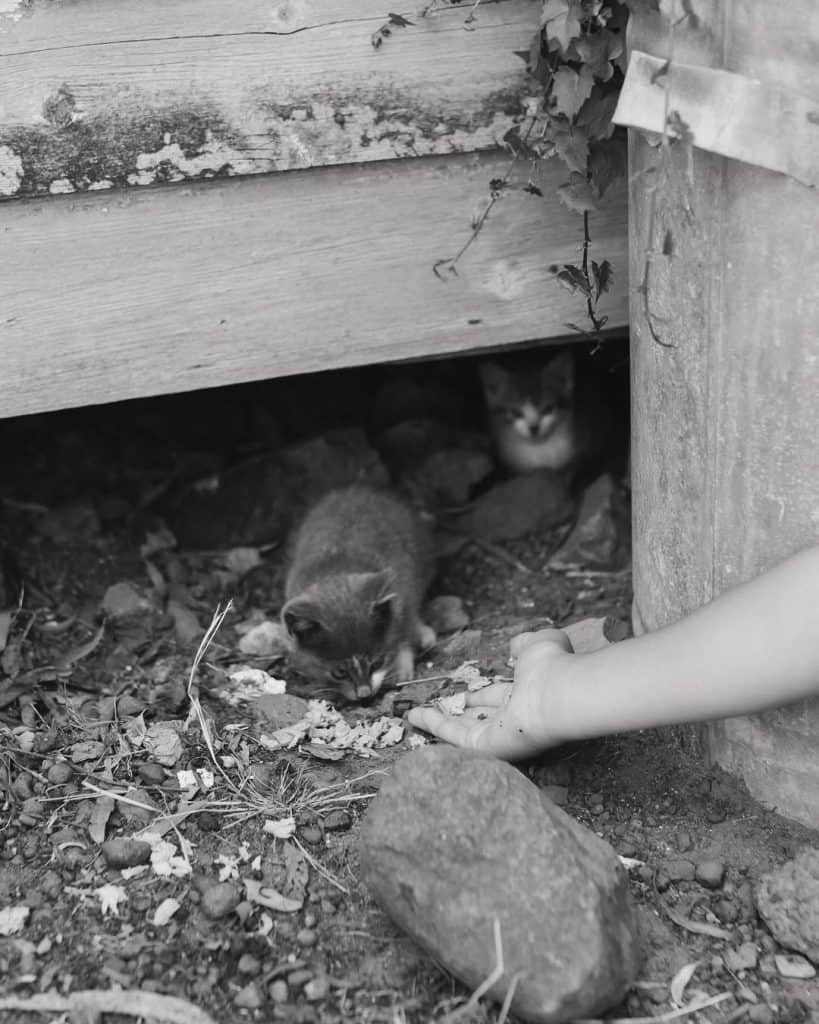 Peeking out from the shadowy gap under the barn was a trembling kitten, no bigger than the palm of a hand.