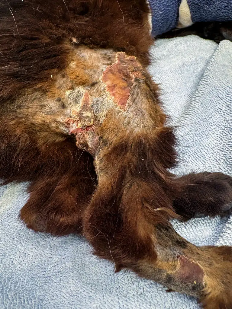 Her fur was burned away in places, leaving raw skin that stung with every movement.