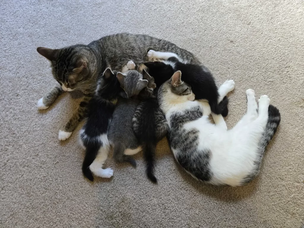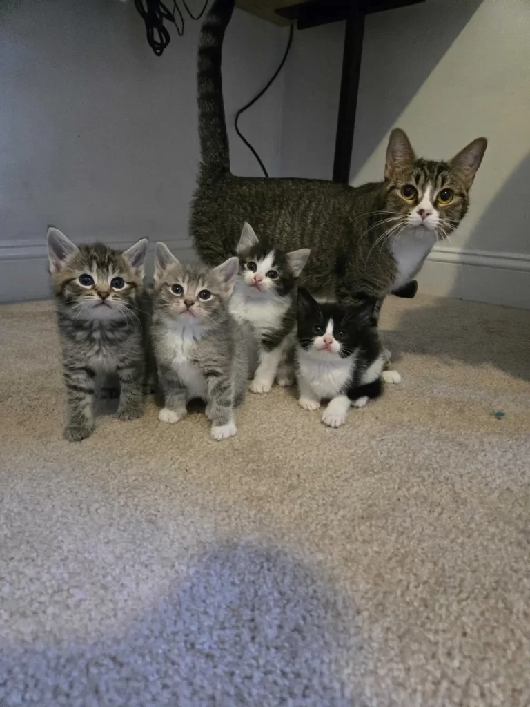 Curled together in the tight space was an entire feline family. A mother cat, her young daughter, and four tiny kittens huddled side by side.