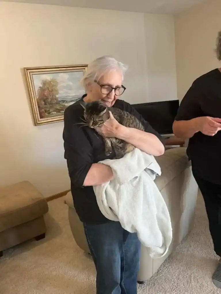 It didn’t take long for Ellie’s old habits to return — climbing into Jan’s lap, rubbing her face against Jan’s hand, and purring so loudly it echoed through the house.