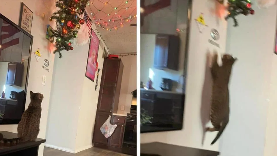 The more he stared at the hanging tree, the more determined he became to conquer it. He began studying the angles, watching how the lights swayed when the heater kicked on, and calculating just how far he’d have to leap to reach his goal.