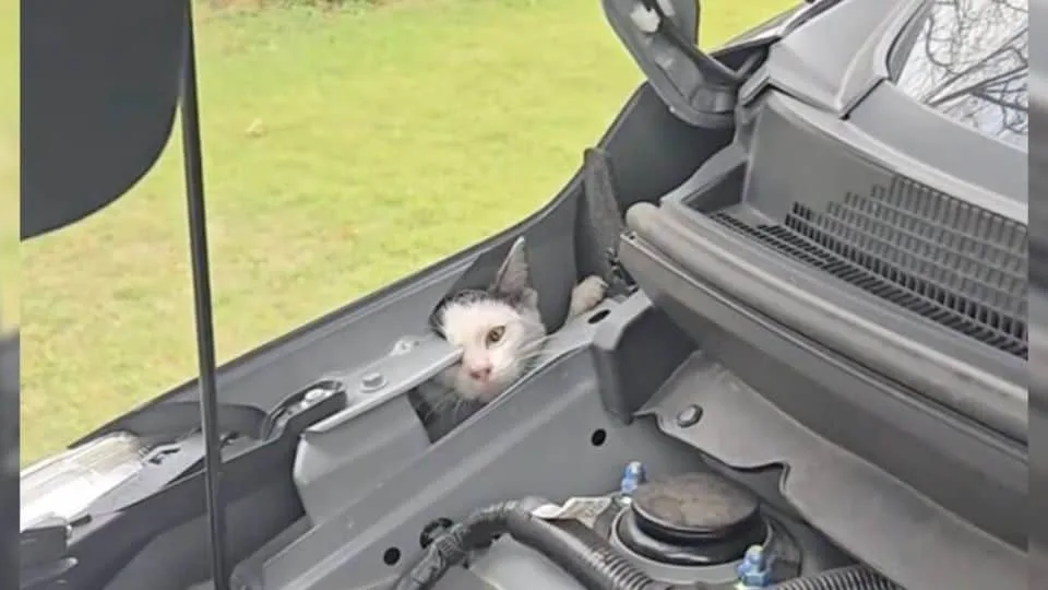 Shaken, Sara pulled into the first neighborhood she saw. She stopped the engine, stepped out, and listened. There it was again — that soft, desperate meow. Somewhere deep inside the front of the car, a little life was begging for help.