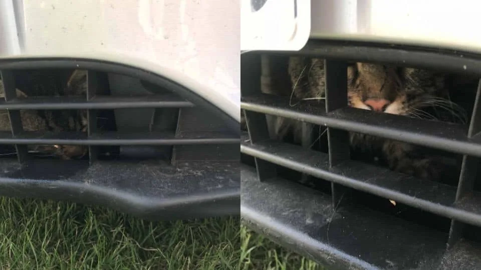 As he moved closer, realization struck — a cat was wedged deep inside the car’s front panel. Somehow, the small creature had managed to crawl in and stay hidden through miles of travel.