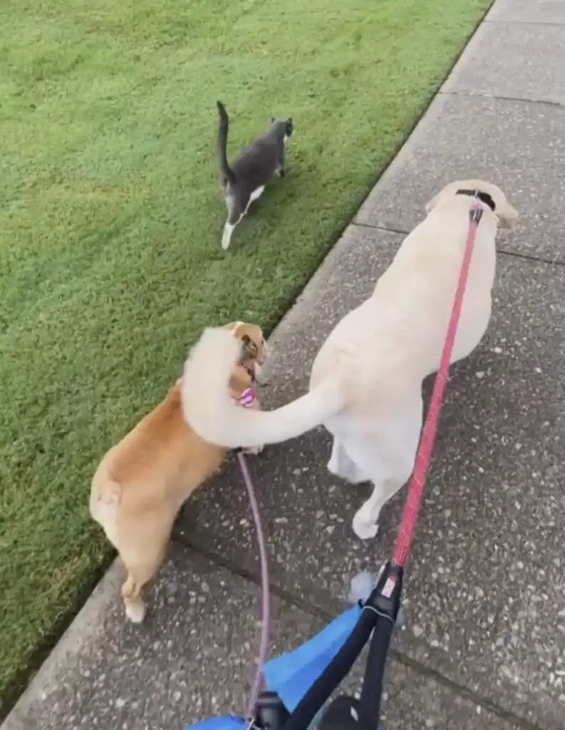 Neighbors have stopped and stared more than once, smiling at the sight — a confident cat leading two dogs as if he’s their big brother. What started as a funny moment has turned into one of the sweetest routines in the neighborhood.