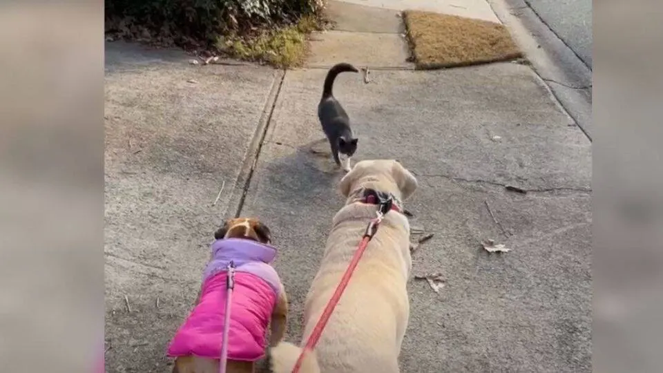 Neighbors have stopped and stared more than once, smiling at the sight — a confident cat leading two dogs as if he’s their big brother. What started as a funny moment has turned into one of the sweetest routines in the neighborhood.