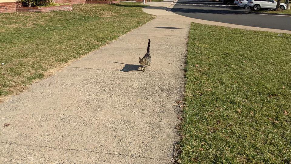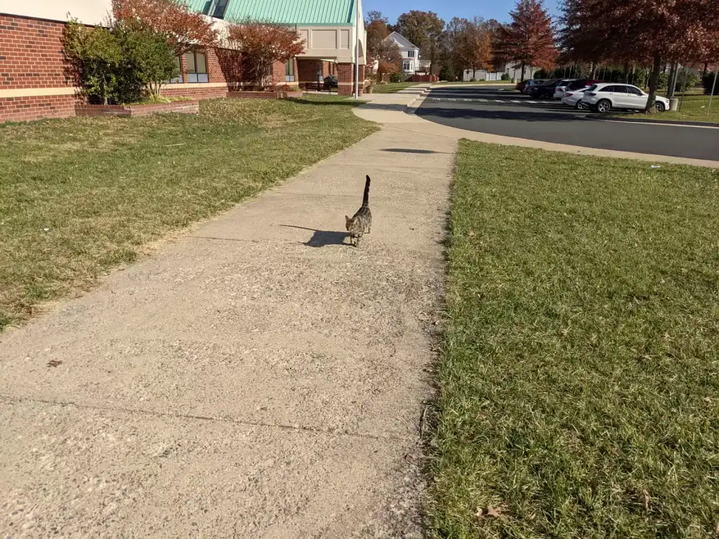 Neighbors often stopped to smile, waving as the confident little cat guided her family back up the driveway like a furry crossing guard.