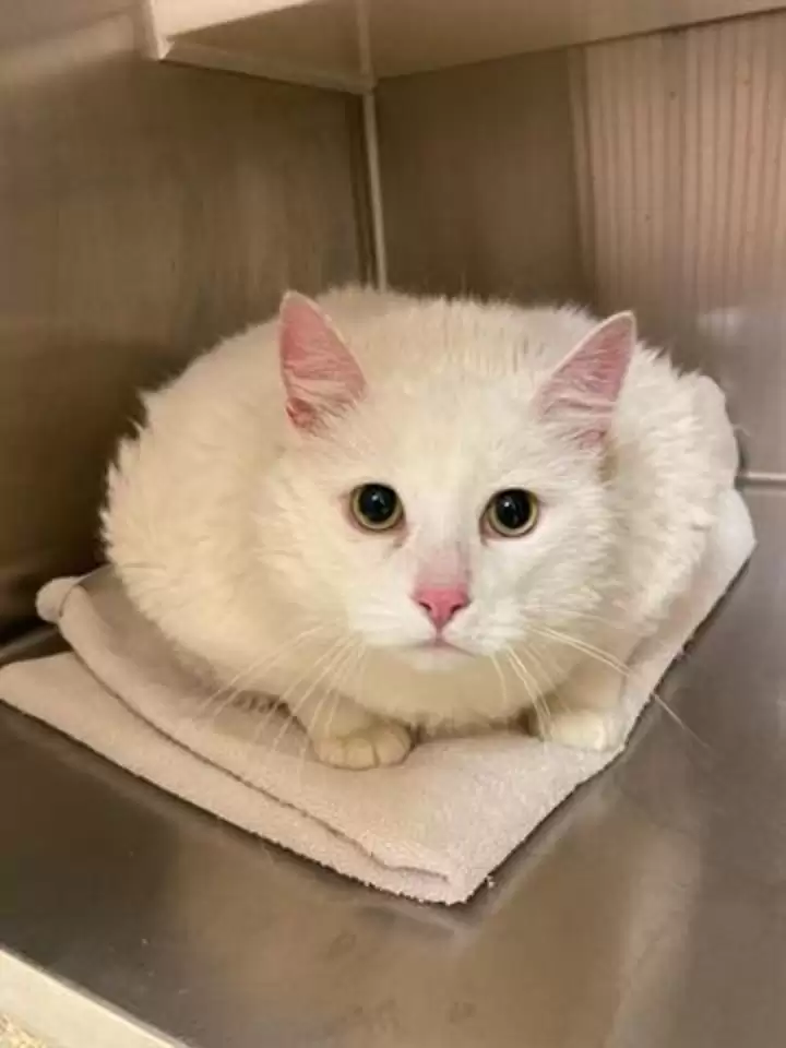 Inside was a snow-white cat with bright eyes, a soft coat — and an astonishing weight of nearly thirty pounds.