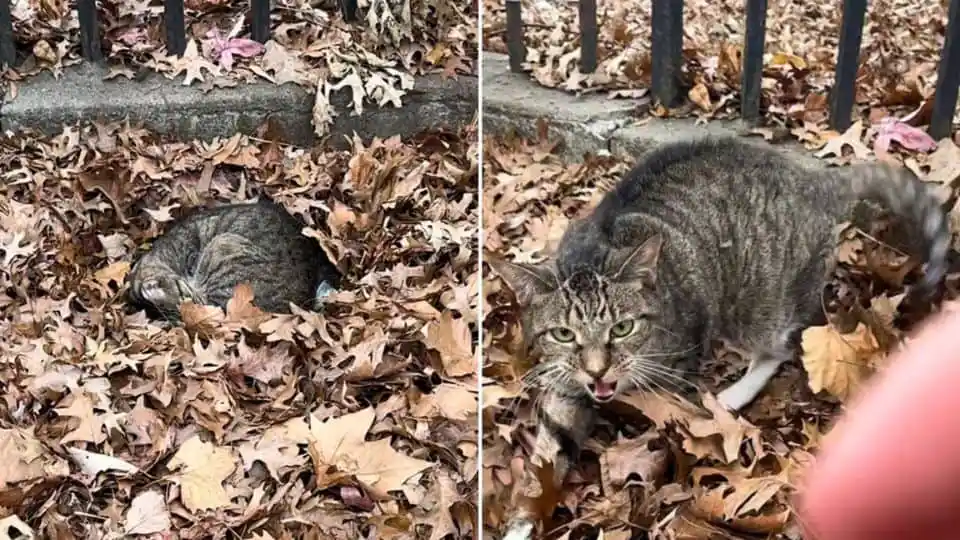 Volunteers grabbed blankets, a carrier, and set off toward the reported spot. What they found broke their hearts — a lonely cat trying to survive in silence, half-buried in fallen leaves for warmth.