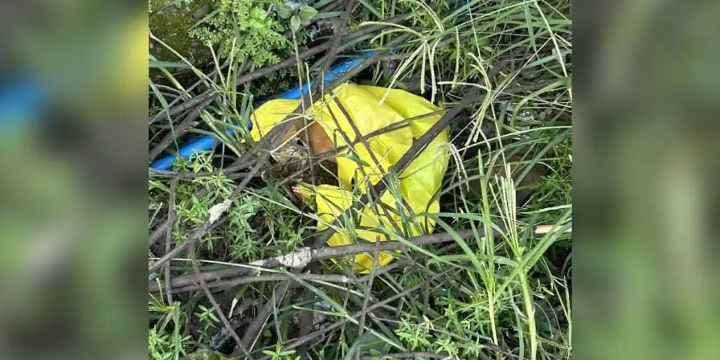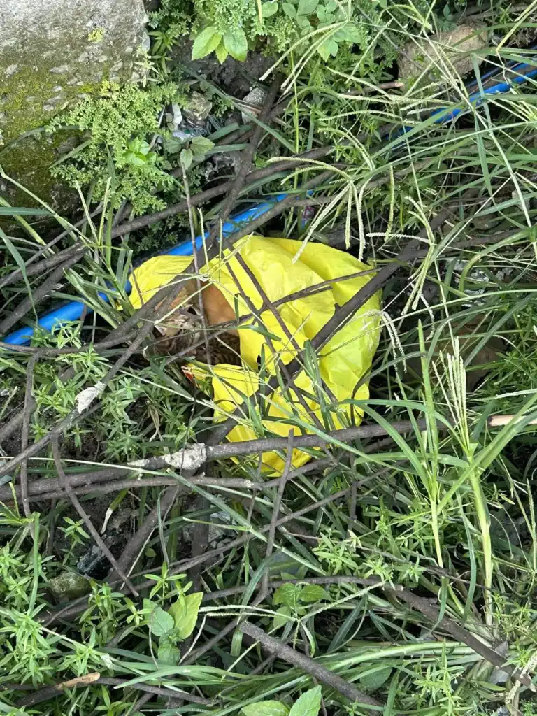 A yellow plastic bag sat in the grass like it didn’t belong there.