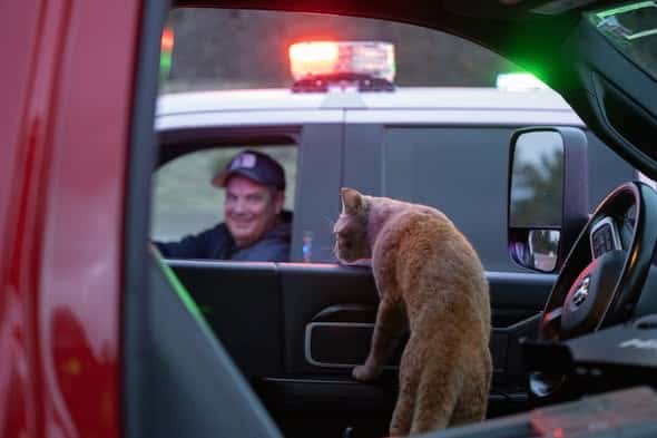 While first responders managed the chaos, the little cat weaved between the trucks, meowing with determination.