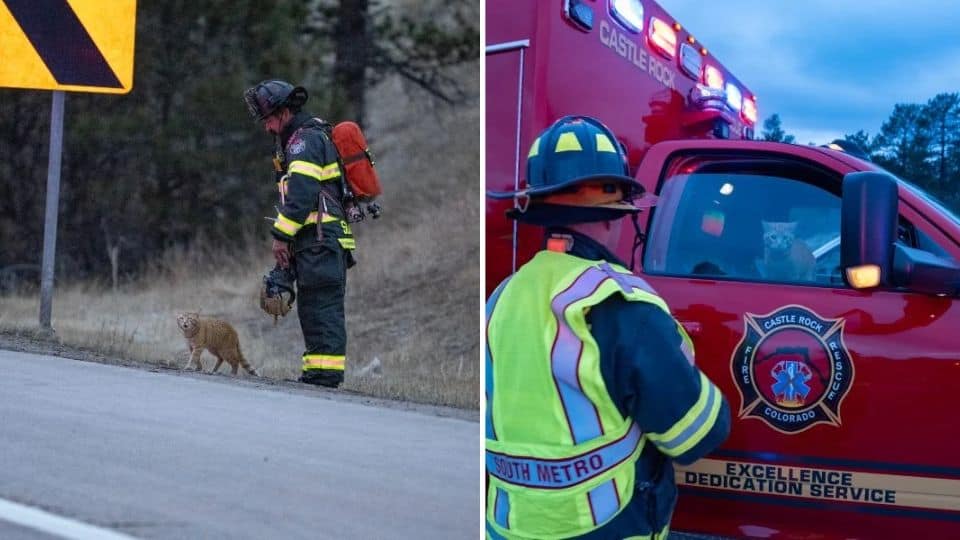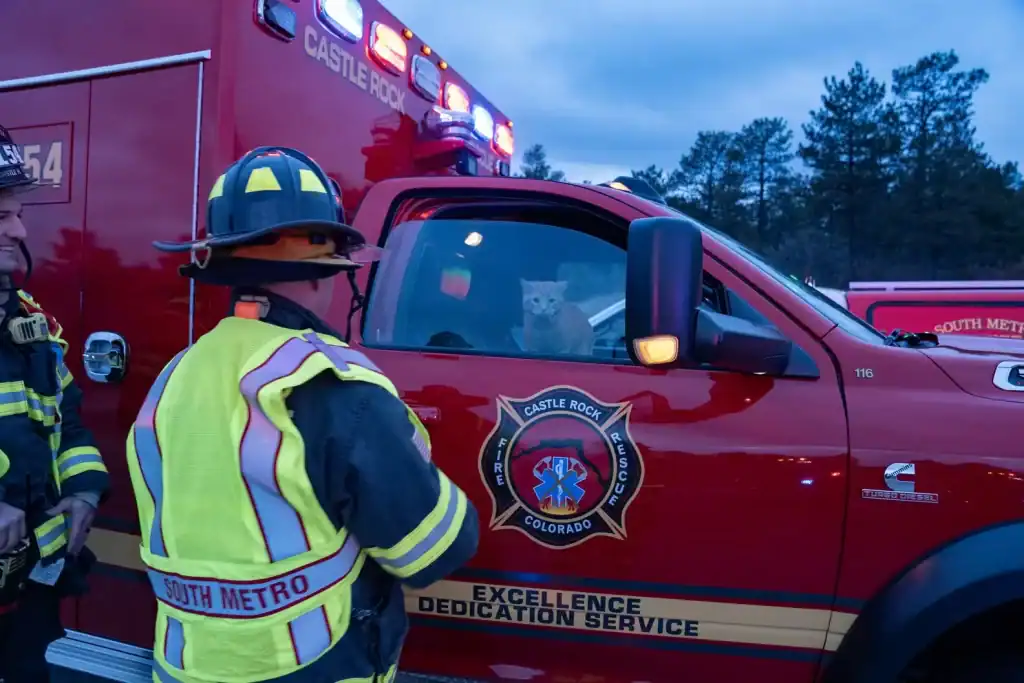 Concerned for his safety, firefighters carefully lifted him into a carrier and placed him inside one of their vehicles, where it was warm and quiet.
