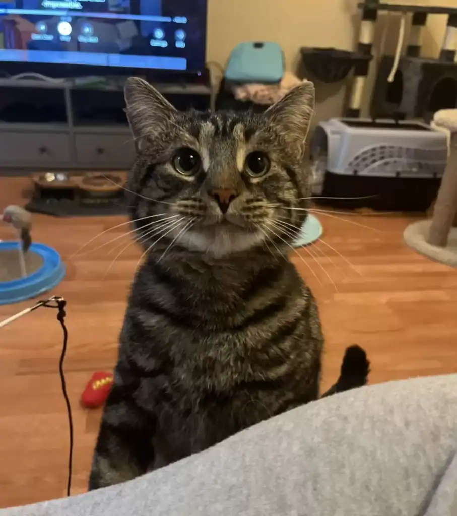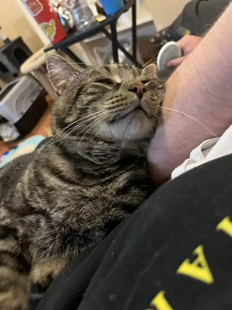 The timid cat who once stared at the floor with half-closed eyes now perked up at the sound of treats and snuggled into the couch like he had lived there forever. His favorite things became obvious: soft surfaces, gentle arms, and tasty puree snacks.