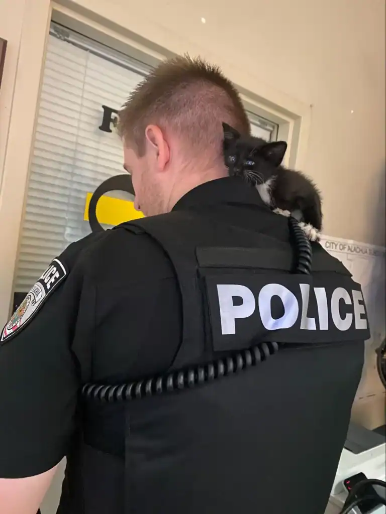 At the police station, the kitten curled into a ball on a folded towel while officers gathered around to take a look. The little one’s fur was jet black and smudged with dust from the road, his eyes still wide with confusion.