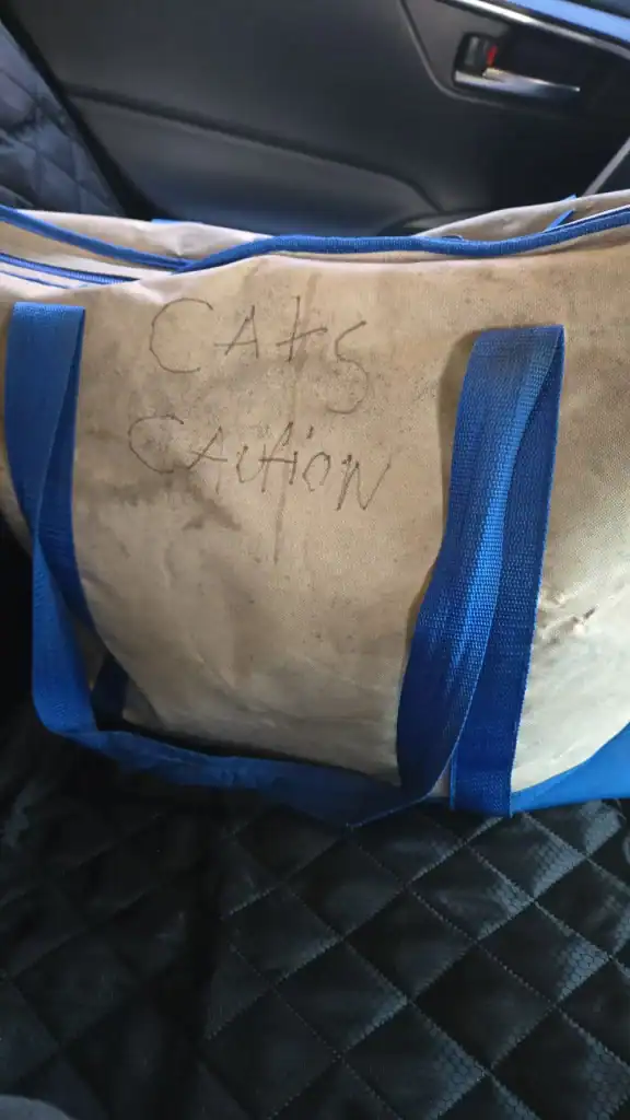 It looked heavy and zipped shut, but what stopped her in her tracks were the words scrawled on one side: “cats caution.”