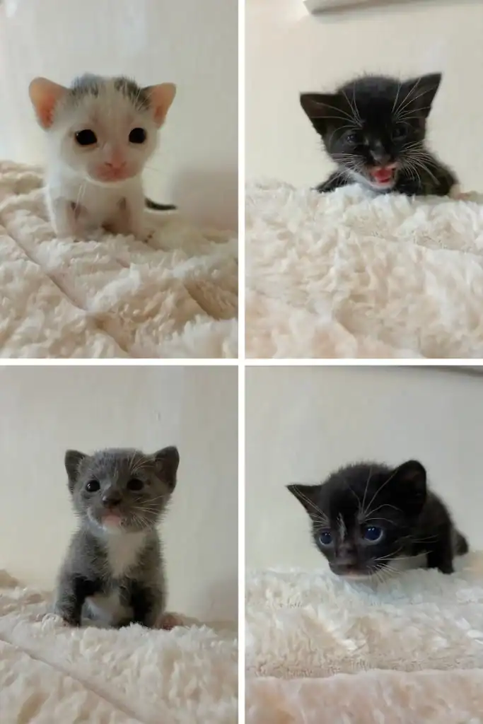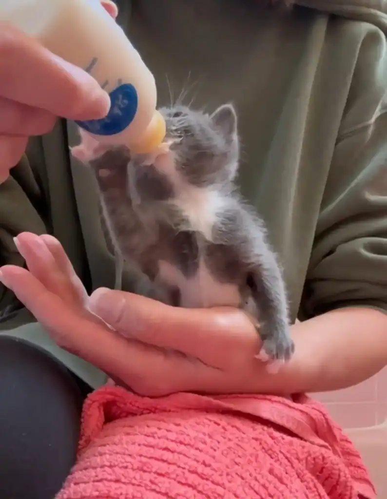 The foster gently cleaned each one, dried their fur, and fed them drops of kitten formula from a bottle. The tiniest of the four purred weakly after eating, curling up against his siblings for warmth. T