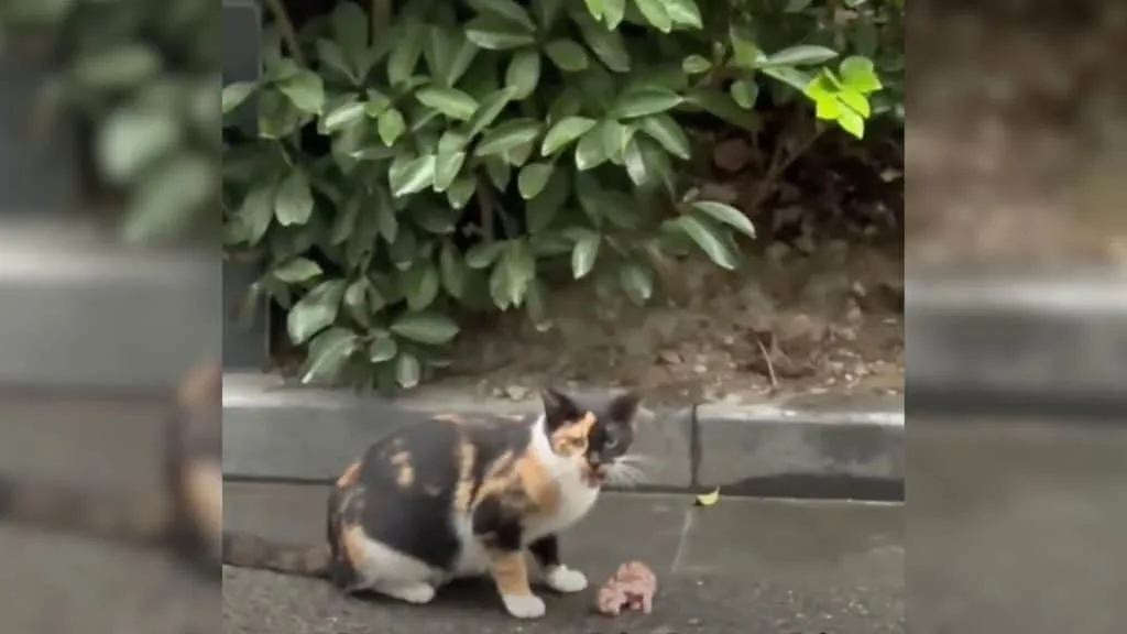 As the woman watched, the adult cat slowly turned away, leaving the newborn trembling on the hard sidewalk.