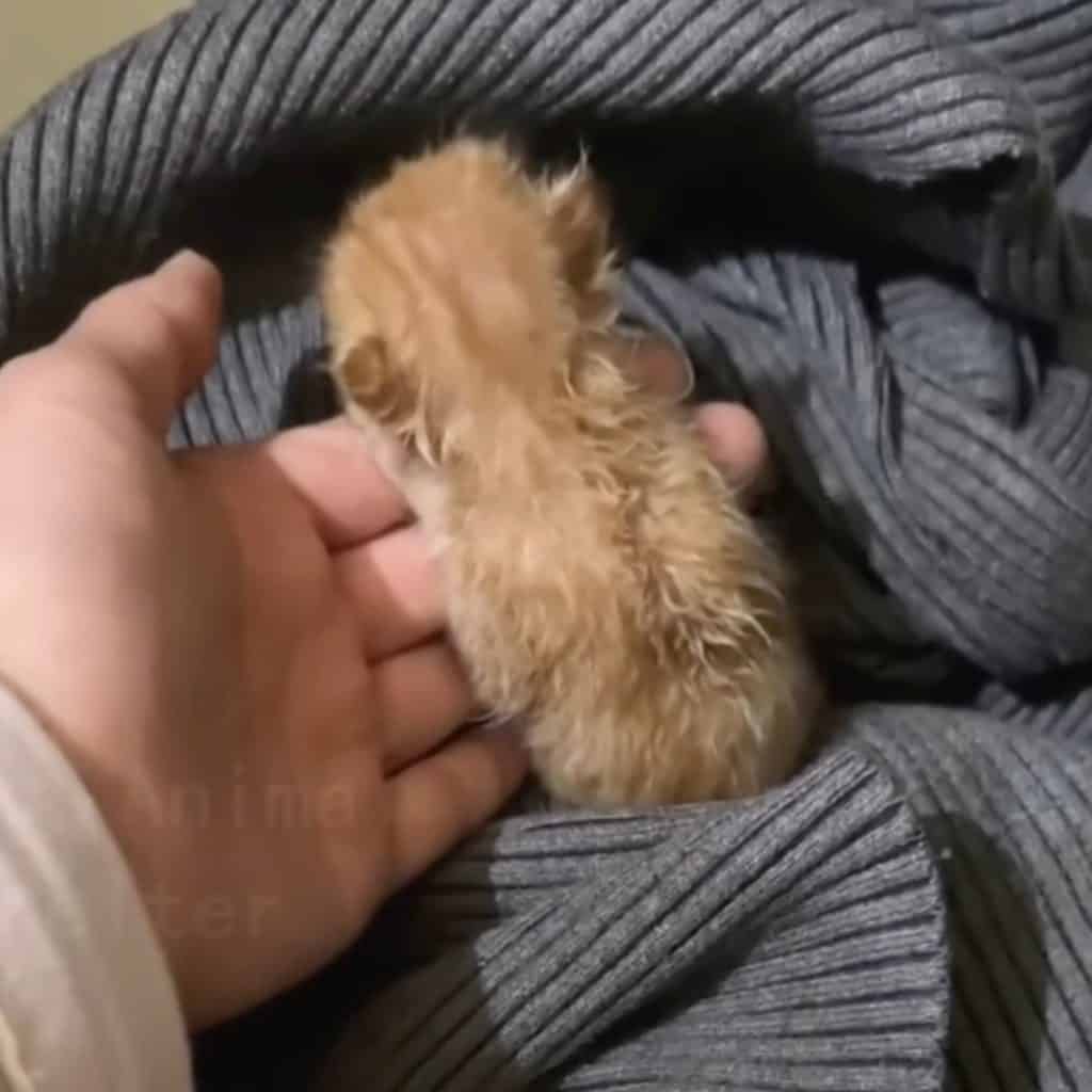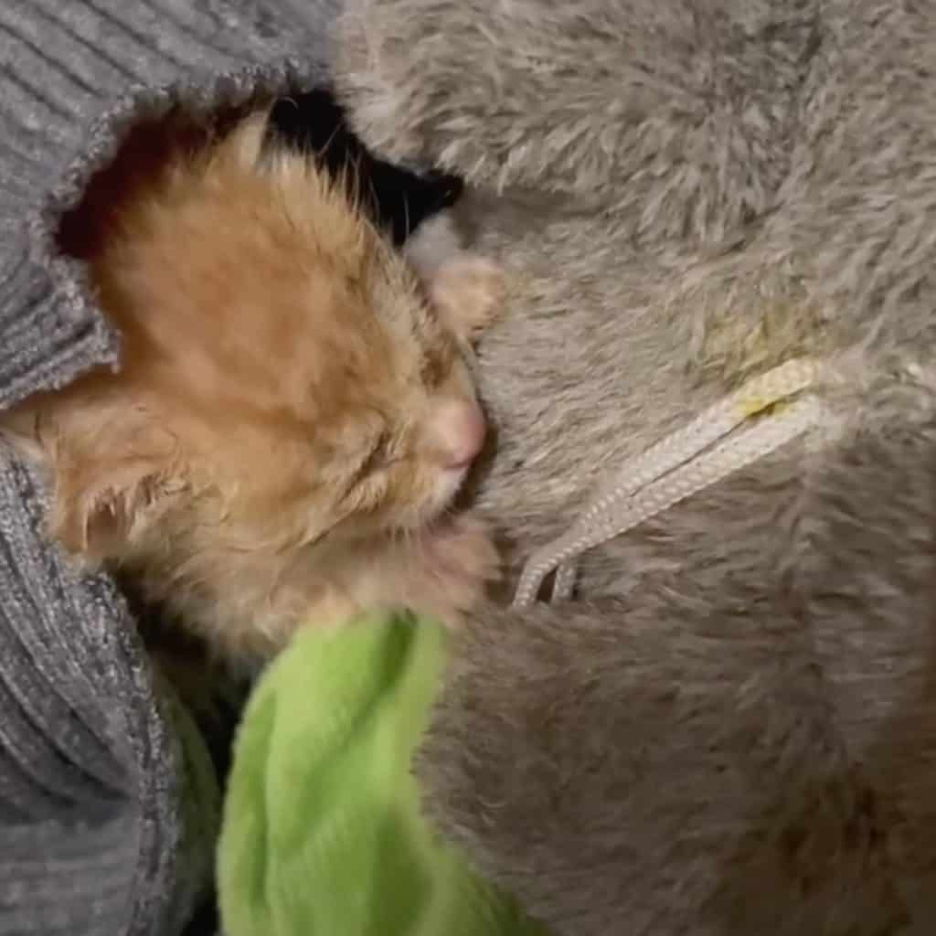 But the woman refused to leave him behind. She carried the helpless ginger baby home, determined to give him every possible chance.