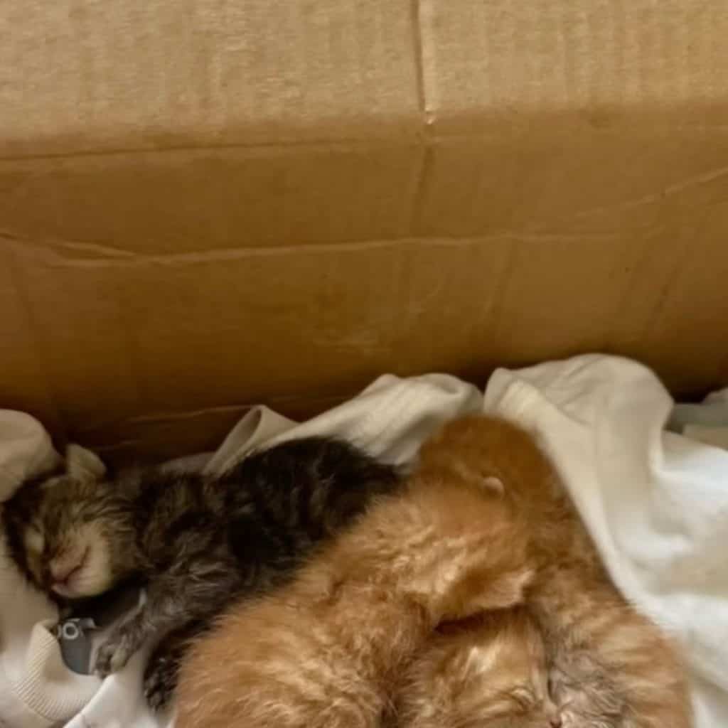 Weeks later, she was walking through her neighborhood again when a familiar kind of cry reached her ears. Tucked beneath a bush was a small box holding four abandoned kittens.