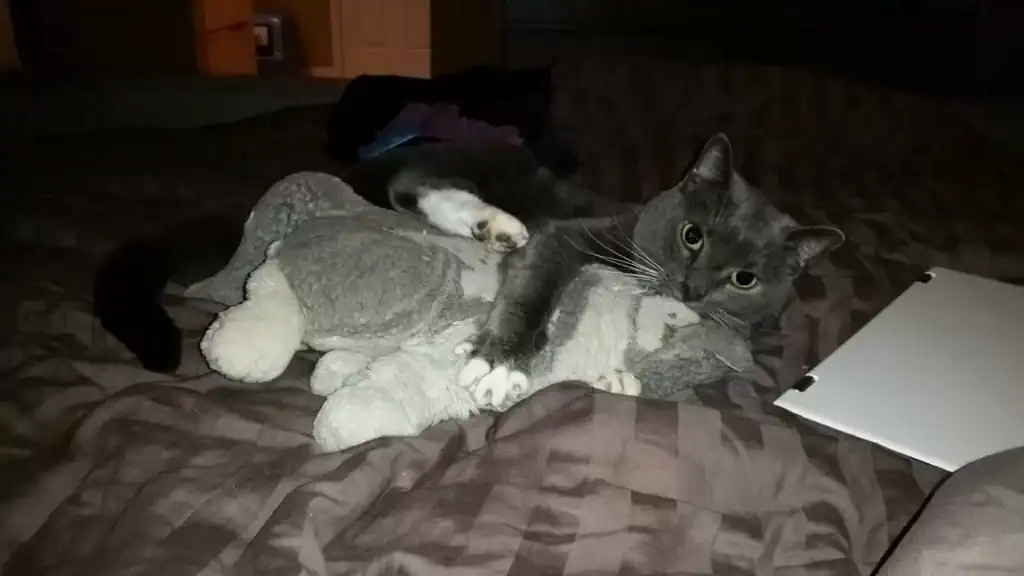 They explained that the stuffed cat doesn’t just keep him busy — it seems to hold deep emotional value, almost as if it carries memories of the home he lost.