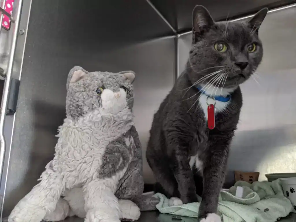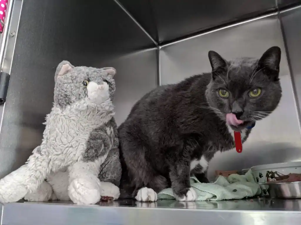 Now, inside the walls of the shelter, the elderly cat is adjusting to a new life filled with unfamiliar sounds, smells, and faces — but he never lets go of his plush friend.