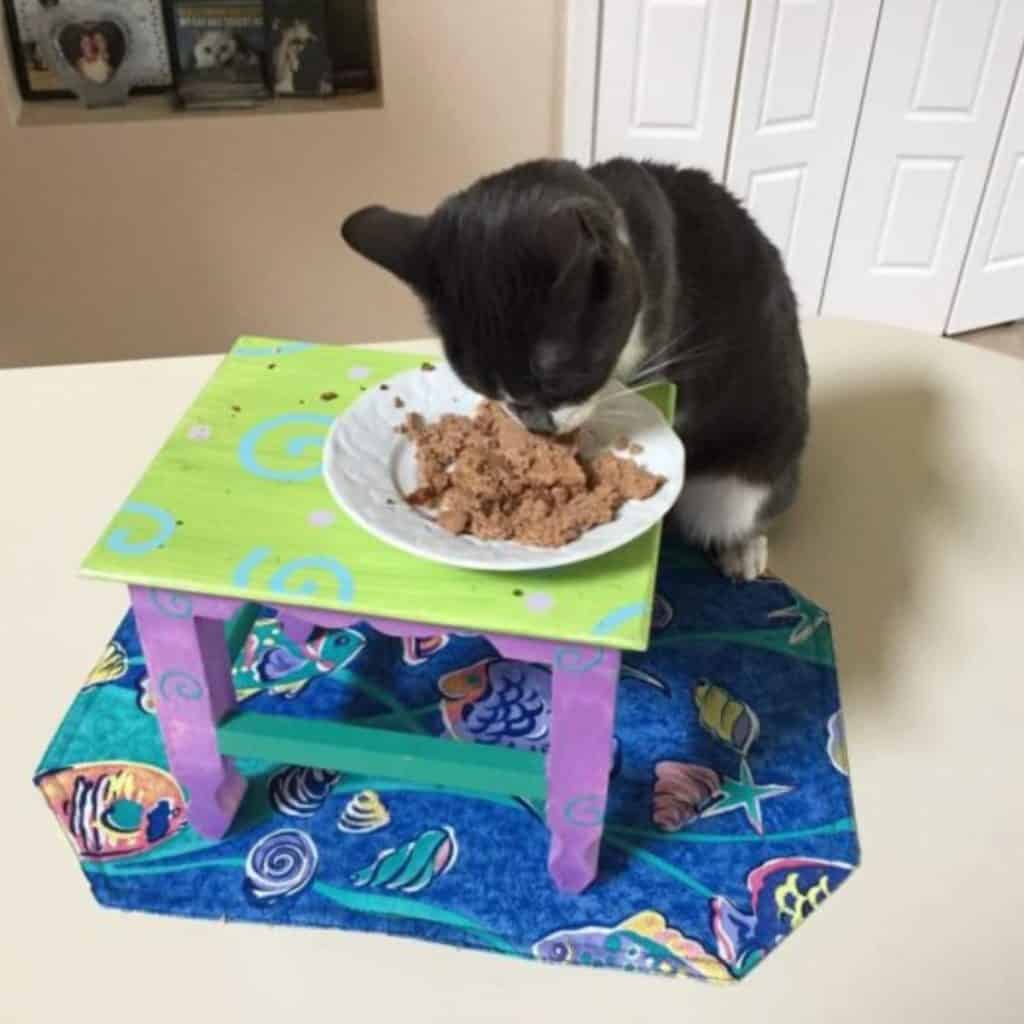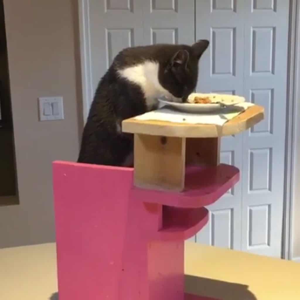 She built a tiny highchair for the kitten with her own hands, crafting it with more love than wood.