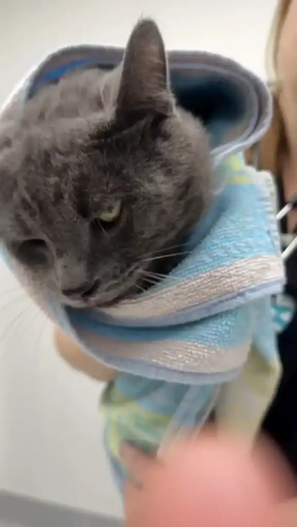 Fiona’s arms became both a shield and a lifeline as she hurried toward the nearest veterinary clinic. The cat’s body trembled, his fur damp with blood, but his eyes fixed on her face as if he understood she was his only chance.