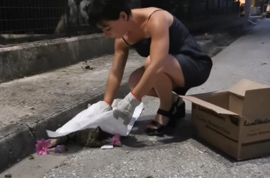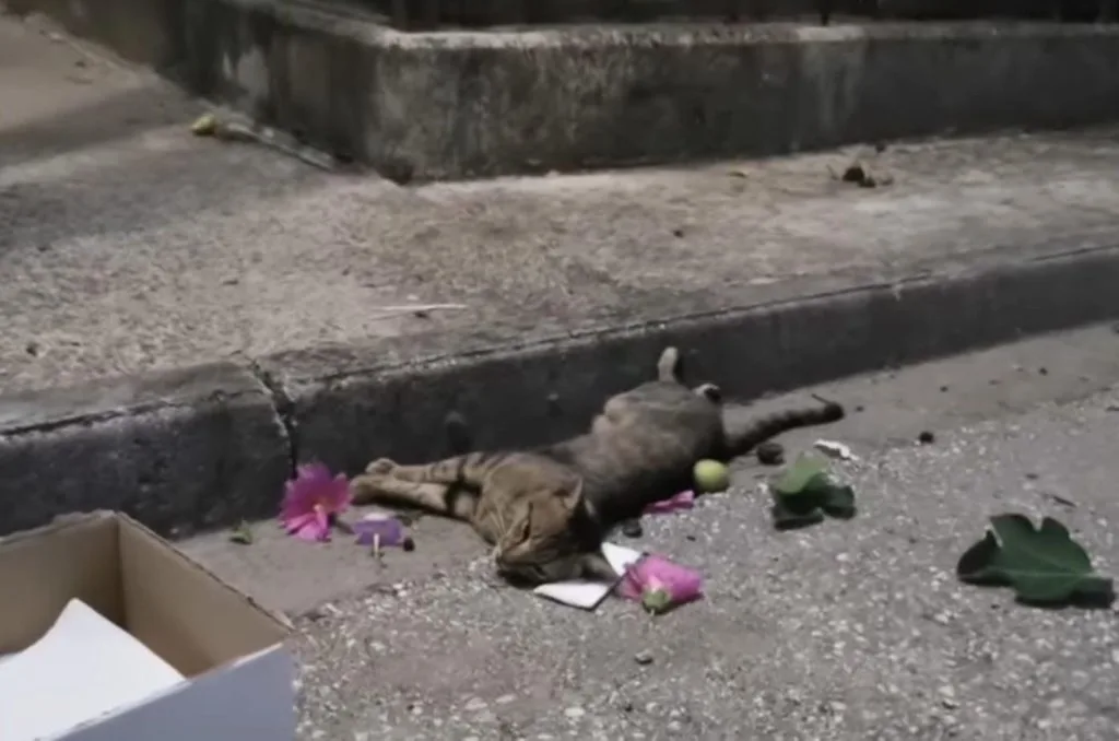 Nearby, a cardboard box and scattered flowers rested on the ground.